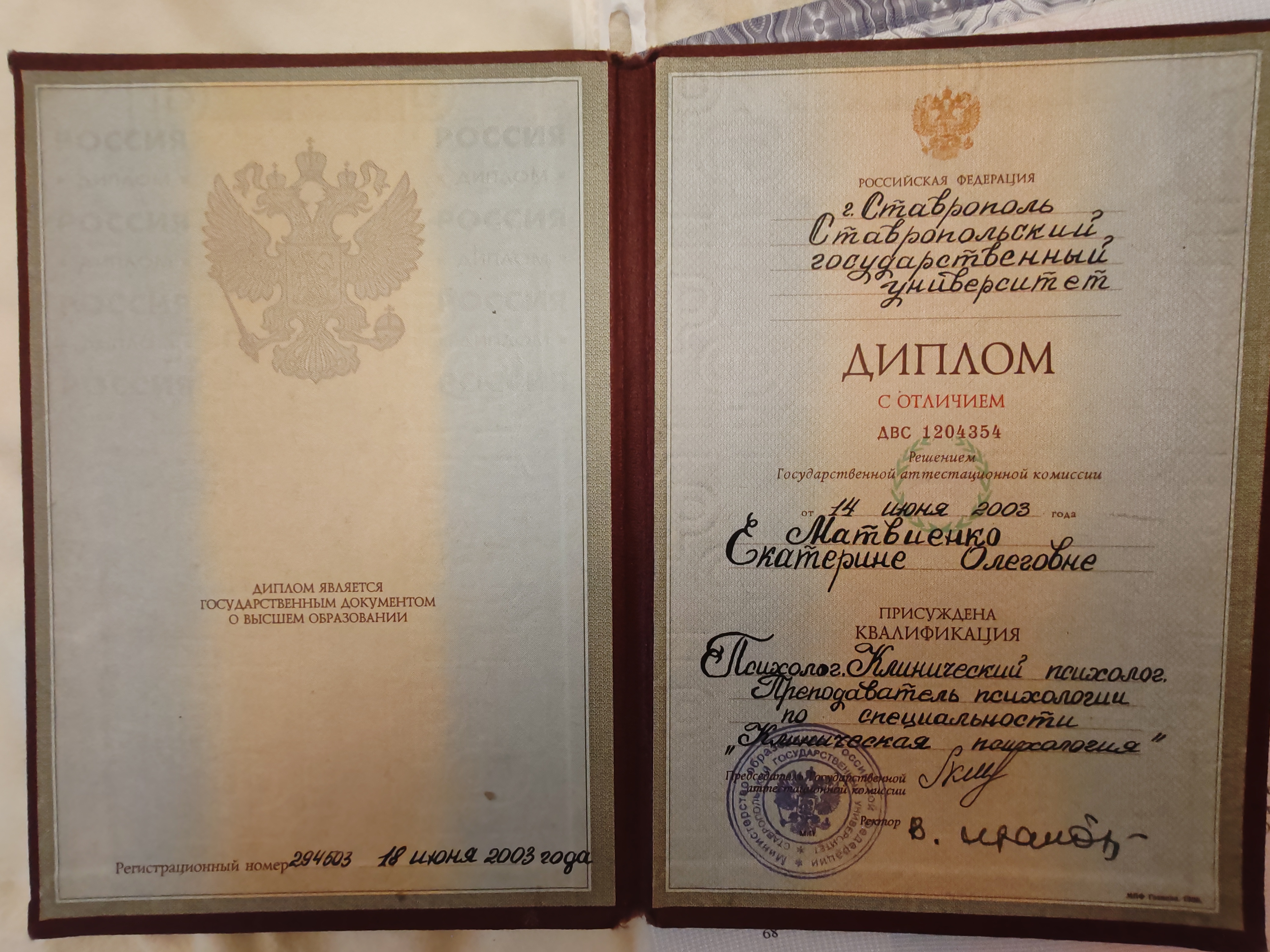 - Ставропольский Государственный Университет. Факультет психологии. Отделение клинической психологии Клинический психолог. Преподаватель по специальности "Клиническая психология" 2003